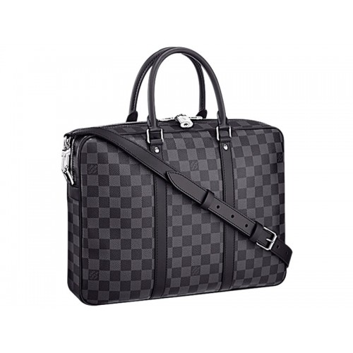 A Porte-Documents Voyage PM könnyedén stílusosnak tűnik férfias Damier Graphite vásznon. Sima bőr díszítéssel és tágas belsővel ötvözi a luxust és a praktikumot.