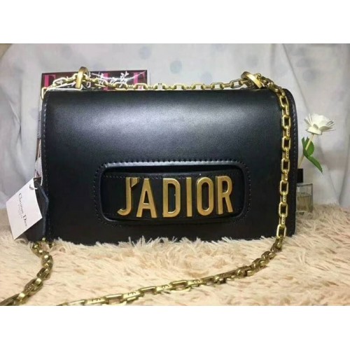 Flap táska réses kézkapoccsal fekete borjúbőrből, J'Adior aláírással és levehető húzózsinórral öregített arany tónusú fém lánc.
