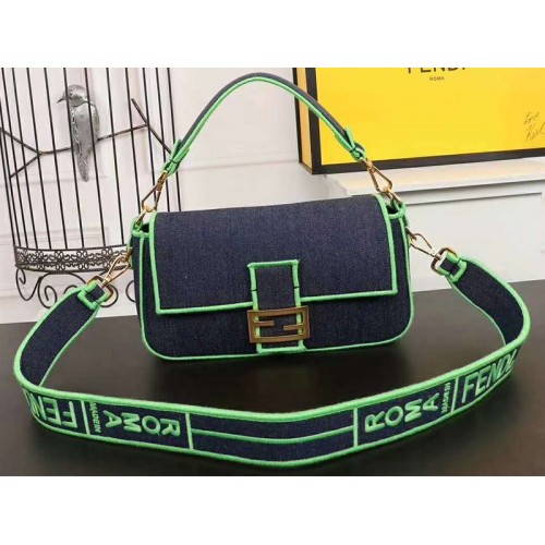 Iconic Baguette táska nagy méretben, csappantyúval és FF rögzítéssel mágneses csattal. Bélés cipzáras zsebbel. Kézzel hordható vagy hordható keresztben a fogantyújának és a vállpántjának köszönhetően, mindkettő levehető. Sötétkék pamut farmerből, zöld szál hímzéssel szegélyezett. Fendi Label hímzéssel személyre szabott hosszú vállpánt. Arany bevonatú fémáru.