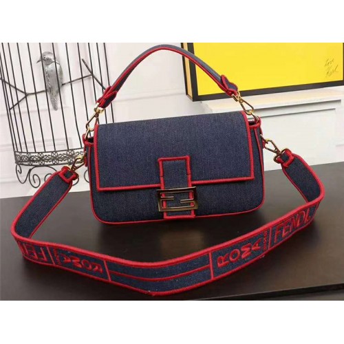 Iconic Baguette táska nagy méretben, csappantyúval és FF rögzítéssel mágneses csattal. Bélés cipzáras zsebbel. Kézzel hordható vagy hordható keresztben a fogantyújának és a vállpántjának köszönhetően, mindkettő levehető. Sötétkék pamut farmerből, piros cérna hímzésszélekkel. Fendi Label hímzéssel személyre szabott hosszú vállpánt. Arany bevonatú fémáru.