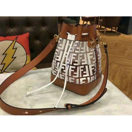 Mon Tresor vödrös táska húzózsinóros rögzítéssel és fém díszítéssel Fendi logó alakban. Két levehető vállpánt, egy hosszú és egy rövid, hogy a táskát kézzel, vállon vagy keresztben hordja. Barna borjúbőrből készült. Ikonikus FF minta emelt nyomattal és kézzel festett feketével. Arany bevonatú fémáru.