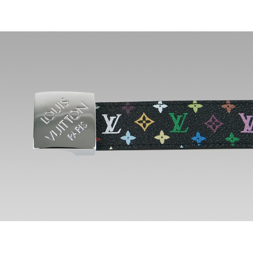 Louis Vuitton öv, ezüst csattal, ferde mintával és fekete, többszínű szabású övvel.