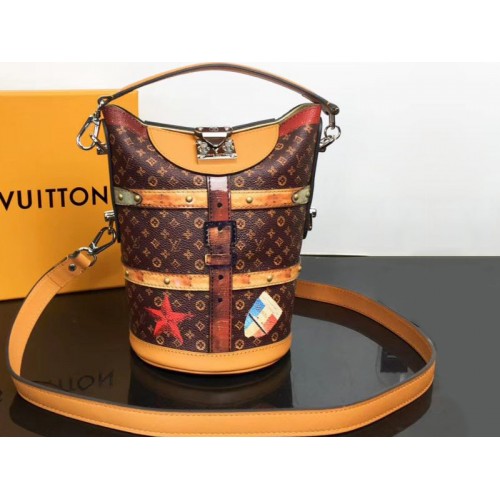 A Duffle Time Trunk kézitáska játékos csavart mutat be a 2018-as őszi-téli ház aláírásaiban. Az átalakított Monogram vásznon festői hatás hívja fel a figyelmet a fényes, történelmi poggyászmatricákra. Csatos pántok és arany tónusú szegecsek bólintanak a Ház törzskészítő gyökereire, így trompe l’oeil hatás a folyamatban. Az érlelt ezüst színű hardver kiegészíti a táska vintage ihletésű megjelenését.