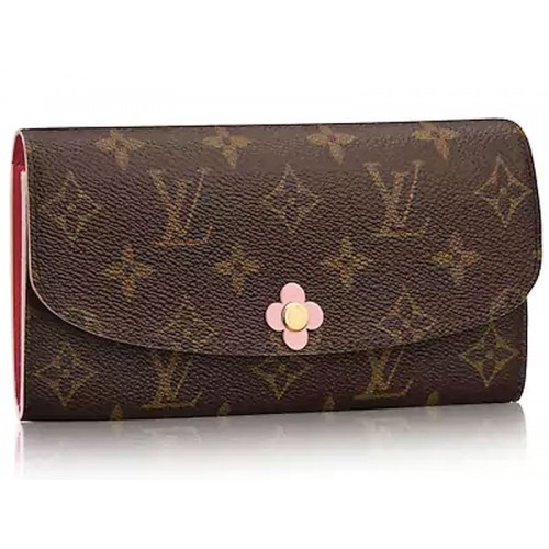 Stílusos és praktikus, a Louis Vuitton klasszikus Emilie Wallet-jét finom, nőies érzet adja a rózsaszín bőr díszítés és az aranyos Monogram virágprés szegecs és báj.